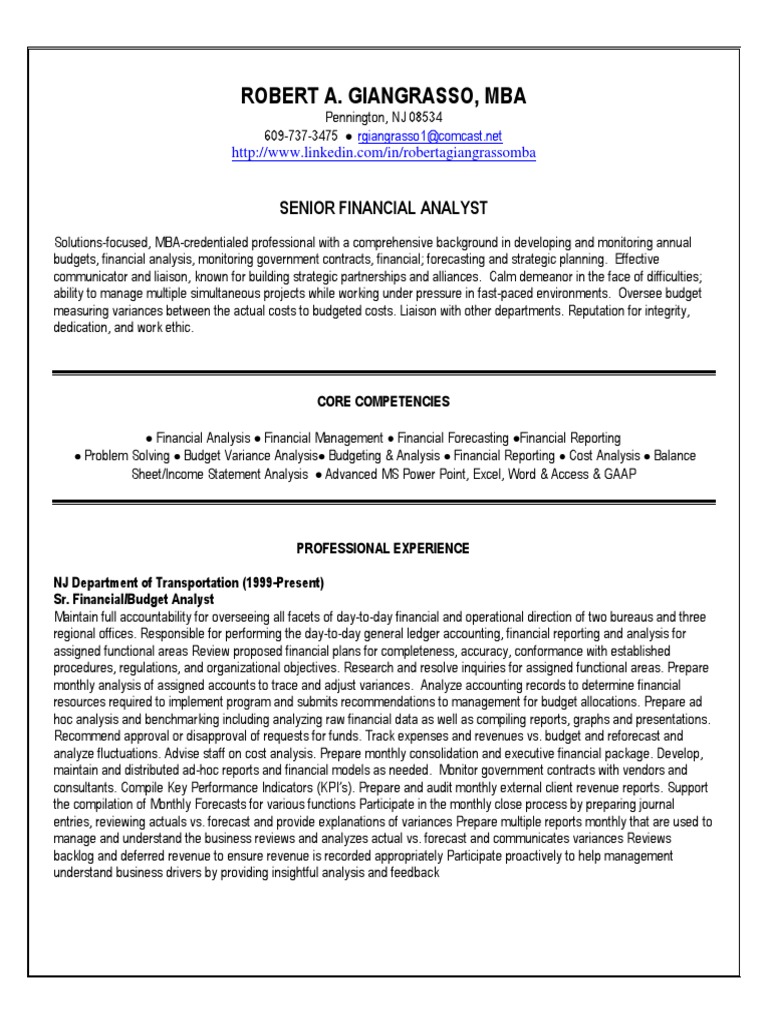 Senior Financial Budget Analyst in NYC Resume Robert ...
